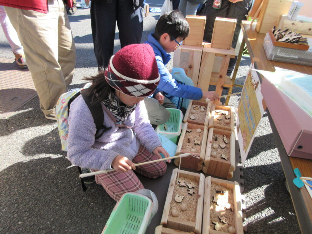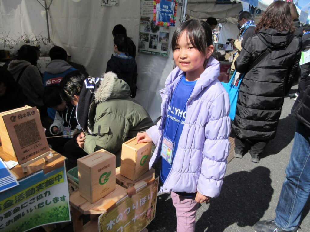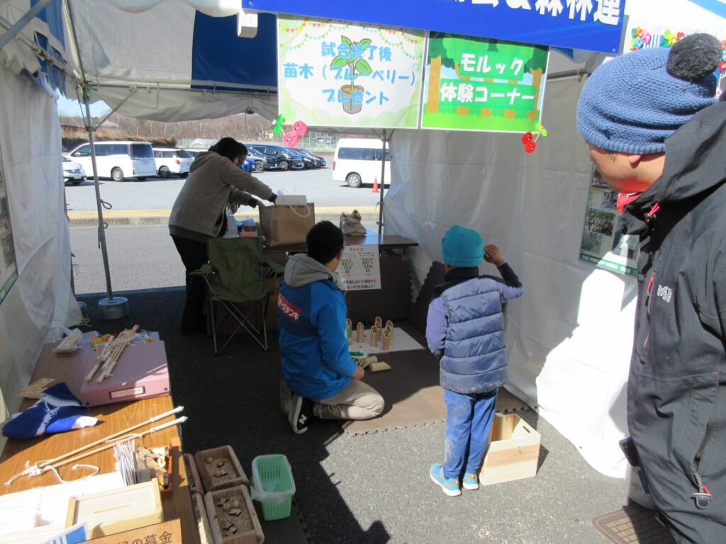 出店ブースでは、緑の募金活動と木製のチャーム釣り、モルック体験、苗木の配布(試合終了後)を行いました。