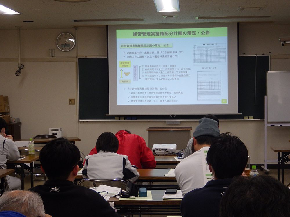 森林経営管理制度がスタートして7年目となりますが、森林所有者の高齢化、世代交代、不在村化、未登記などにより、所有者の特定や境界の明確化に多くの時間と労力を要するという課題を抱えています。県内においては、意向調査を計画的に進めているものの、経営管理権集積計画の作成から市町村による経営管理事業の実施までにはスムーズに至っていないのが現状です。これまで、本県では、100名を超える方々が地域林政アドバイザーとして登録されていますが、市町村からの要請を受けて、アドバイザーが所属する森林組合や法人・団体そして当協会がその受け皿として今後より一層支援できるよう、先進的な取組を行っている栃木県矢板市及び栃木県森連の事例を紹介していただきました。質疑応答では、集積計画地の経営計画との関連や実施権配分計画における費用の算定方法、不明森林所有者探索での弁護士活用、地籍調査業務での予算の確保などについて、意見が交わされるなど有意義な研修となりました。