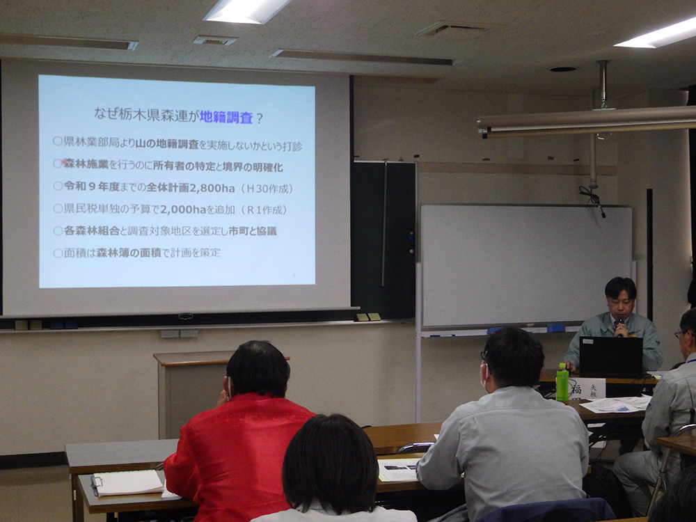 | 研修内容 | (1)栃木県矢板市における地域林政アドバイザーの取組について (令和元年度から継続した森林経営管理制度等の取組支援) 講師:矢板市農林課林政推進室地域林政アドバイザー 福田 昭 氏 (2)栃木県森林組合連合会で取り組む地籍調査 講師:栃木県森林組合連合会業務課長兼地籍調査室長 大嶋 康平 氏 |