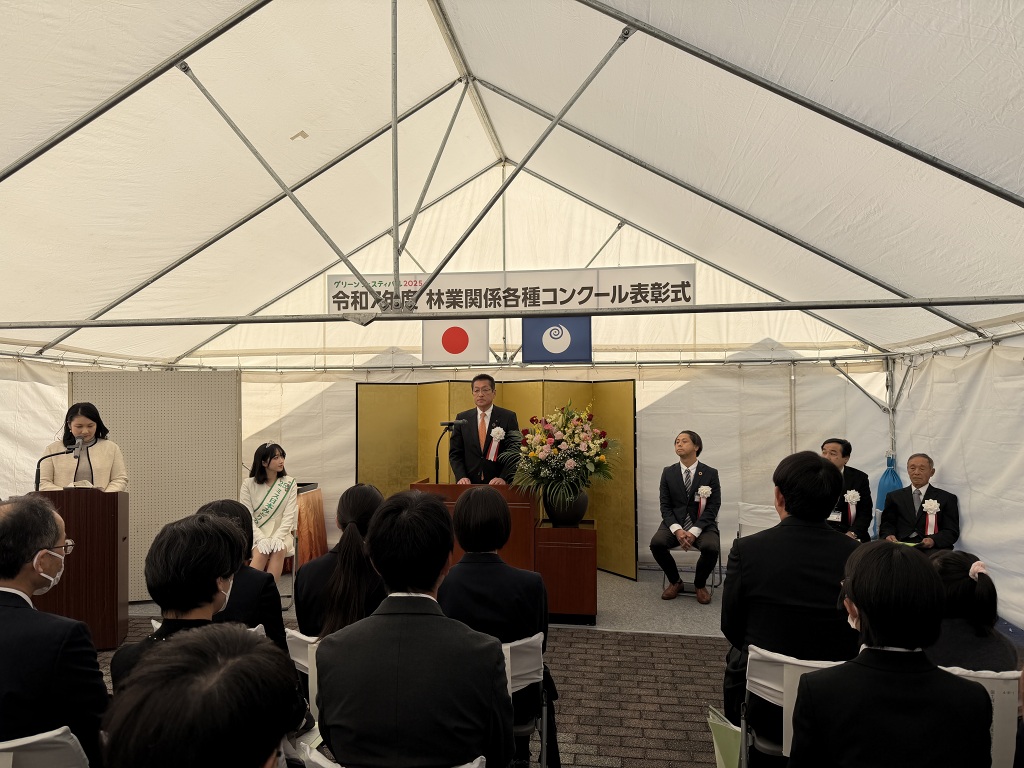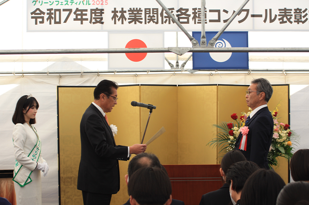 また、茨城県主催の林業関係各種コンクール(林業経営、緑の少年団活動、国土緑化運動・育樹運動ポスター原画など6部門)表彰式が同時開催され、茨城県知事賞ほかの受賞者に賞状が授与されました。