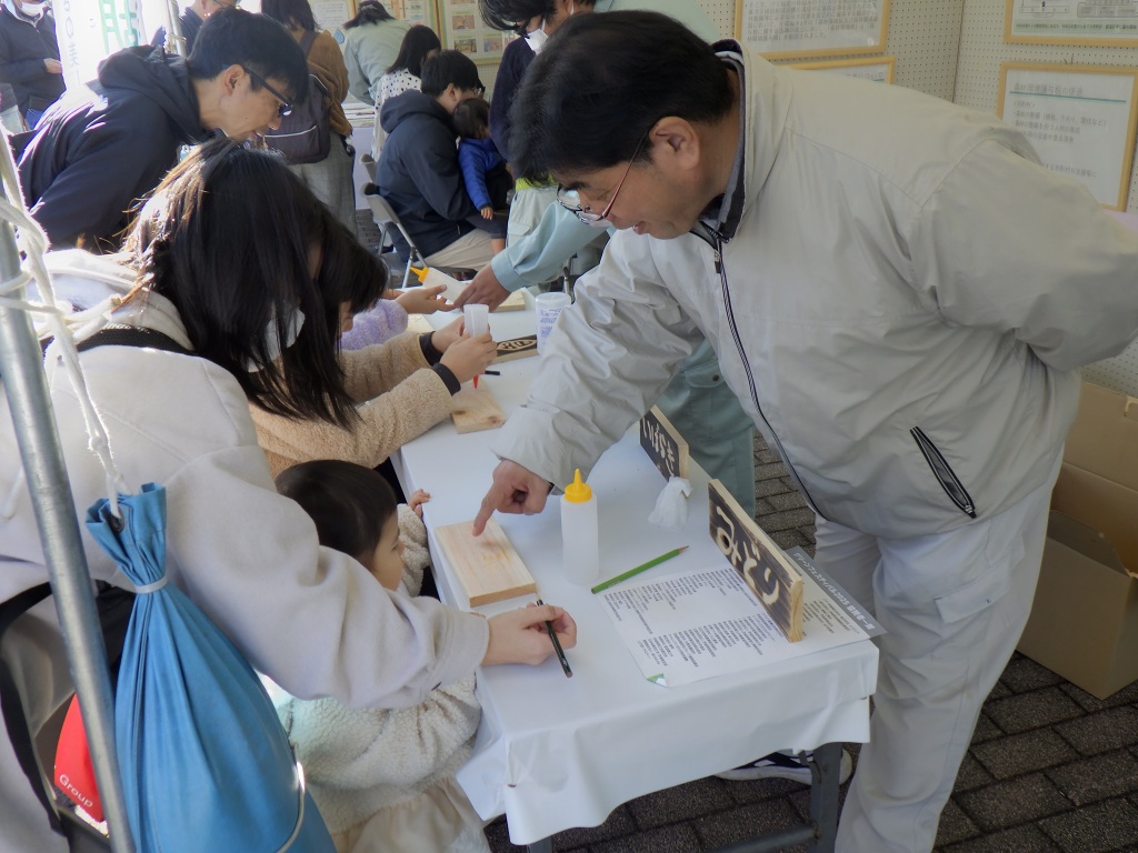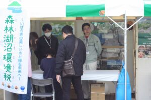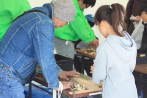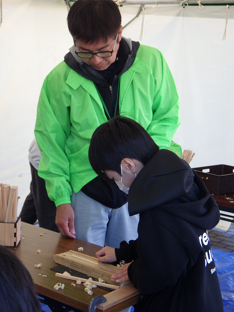 このグリーンフェスティバルの目的は、多くの県民の方々に森林の役割や重要性を理解していただき、森林を守り育てていくことへの共感や関心を高めることにあります。20種類を超えるブーステントでは、自分でヒノキをかんなで削って作成するマイお箸づくりやクリスマスリース、本箱などの木工品、コースターづくりや丸太伐り、バーチャルシミュレーターによる体験など盛りだくさんで、家族連れで参加した方々も多く、子供たちは夢中になって楽しんでいました。また、森林湖沼環境税を活用した施策や試験研究と普及指導の成果PR、コンクール入賞作品の展示もあり、5千人を超える来場者は会場内の各所で足を止め、行列となるブースもあるなど大盛況でした。2025ミス日本みどりの大使も参加して会場内をくまなく回るなど花を添えていただきました。