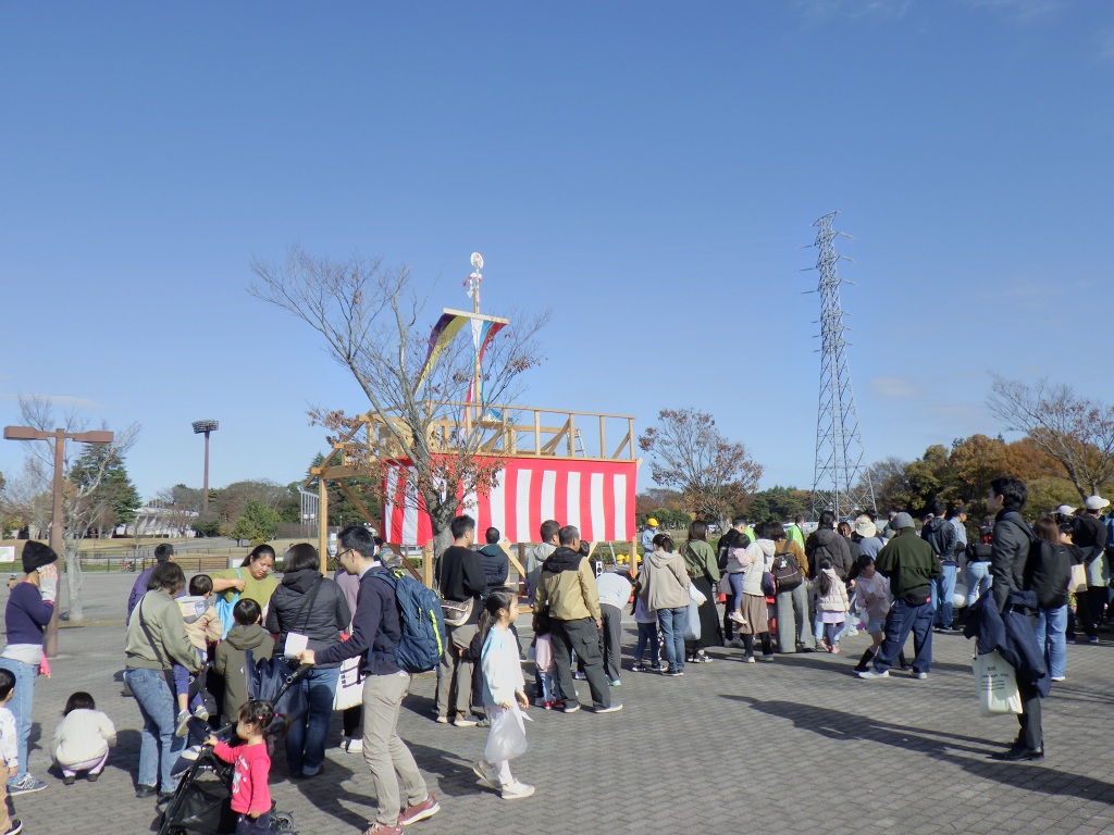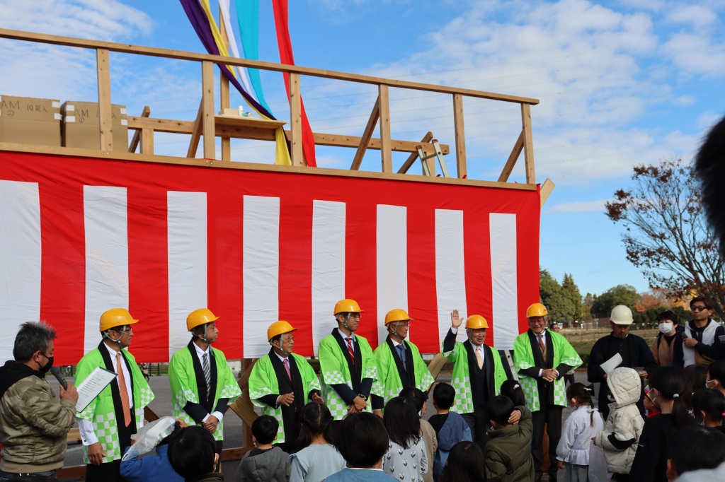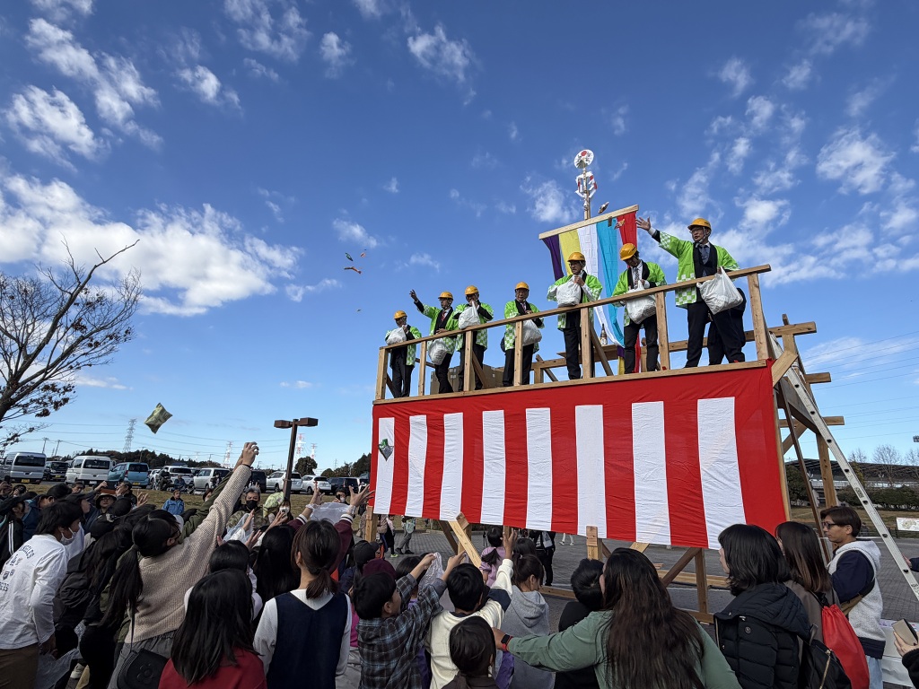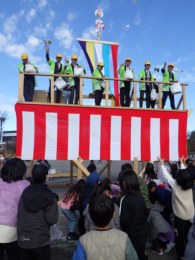 開催セレモニーの後には、通常、住宅の柱が組み上がった時に安全祈願として実施する上棟式の模擬体験では、たくさんのお菓子をキャッチしようと子供から大人まで大賑わいでした。
