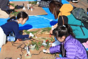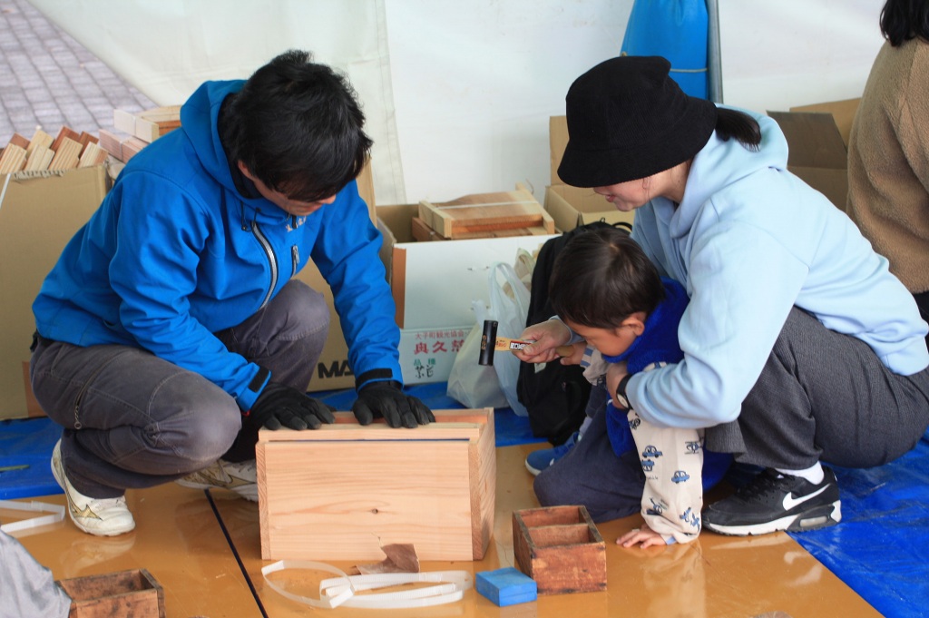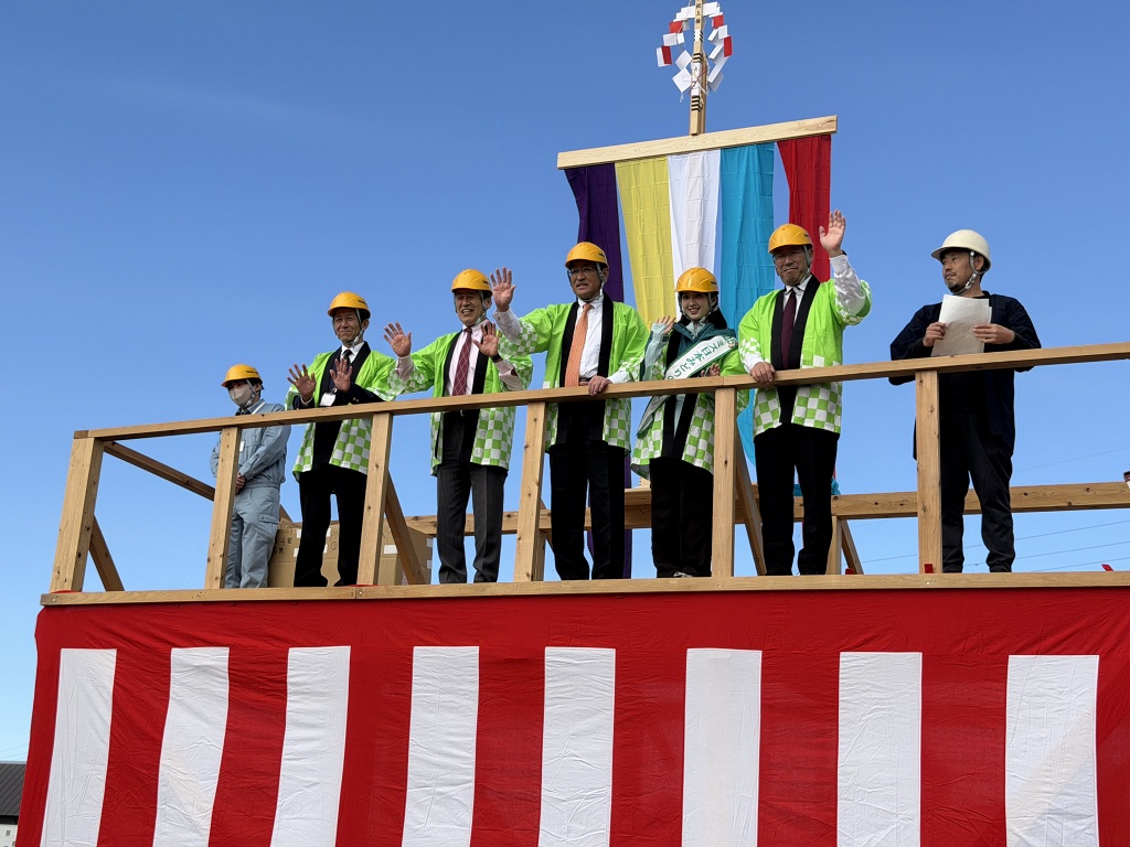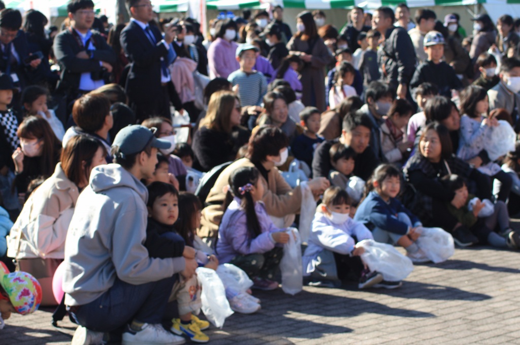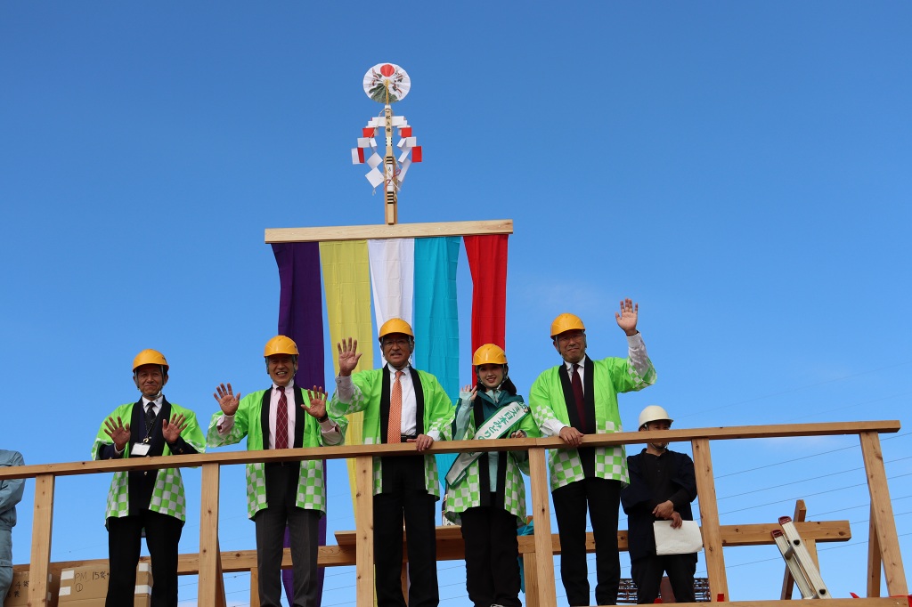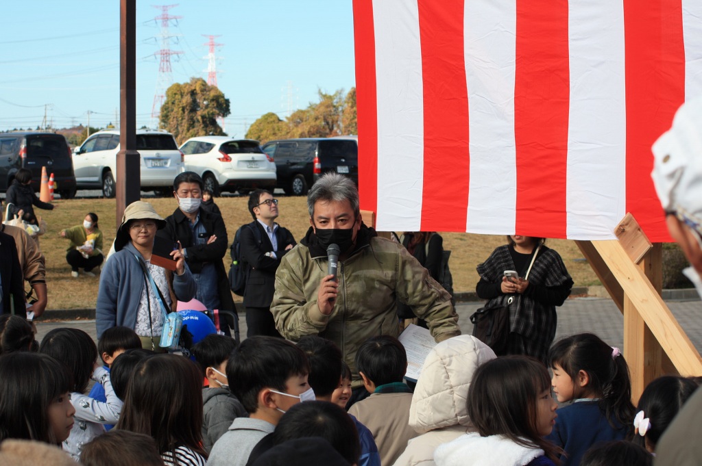開催セレモニーの後には、通常、住宅の柱が組み上がった時に安全祈願として実施する上棟式の模擬体験では、たくさんのお菓子をキャッチしようと子供から大人まで大賑わいでした。