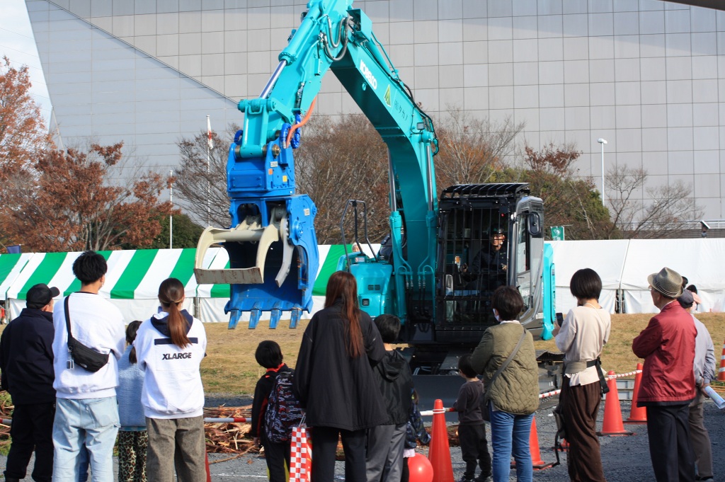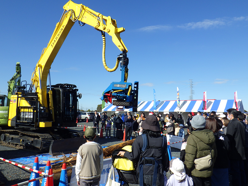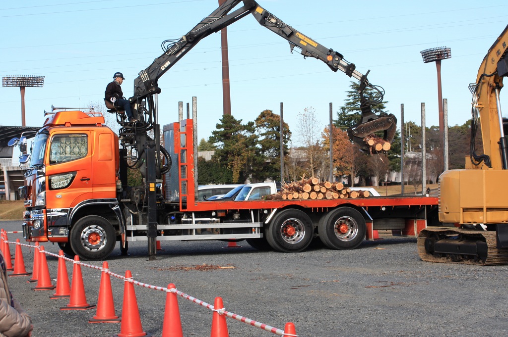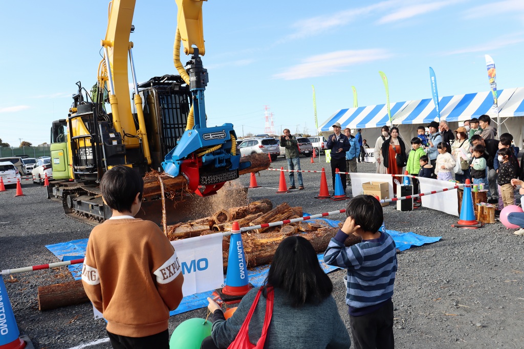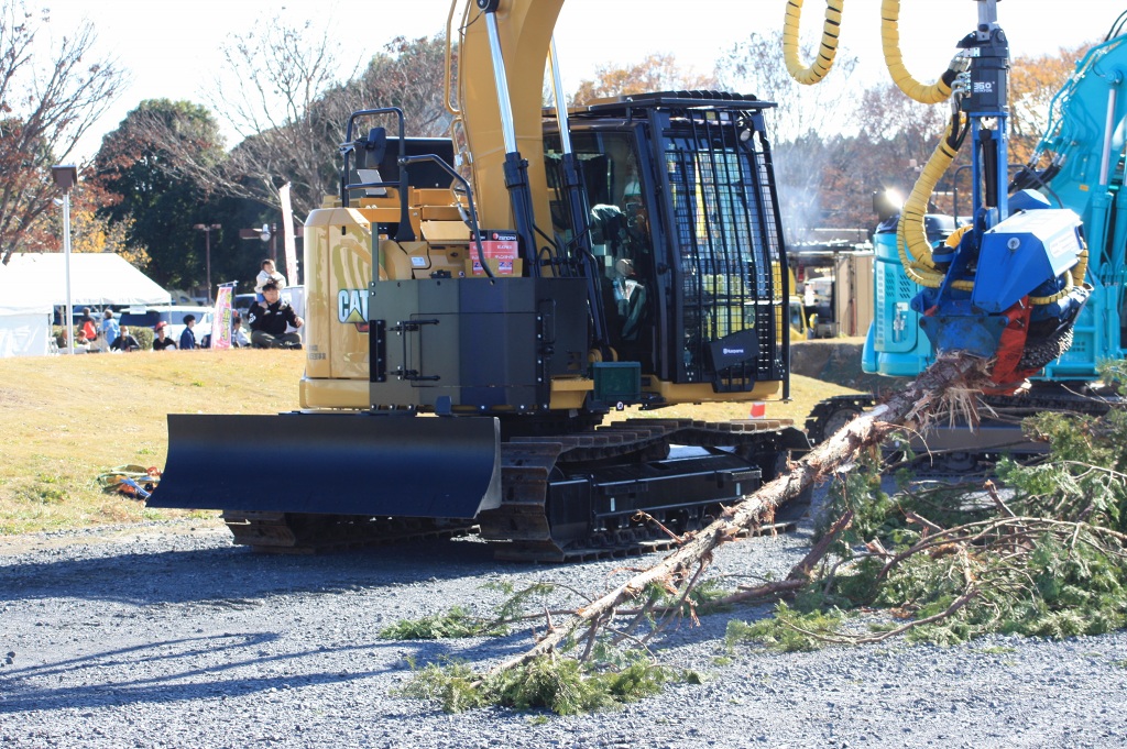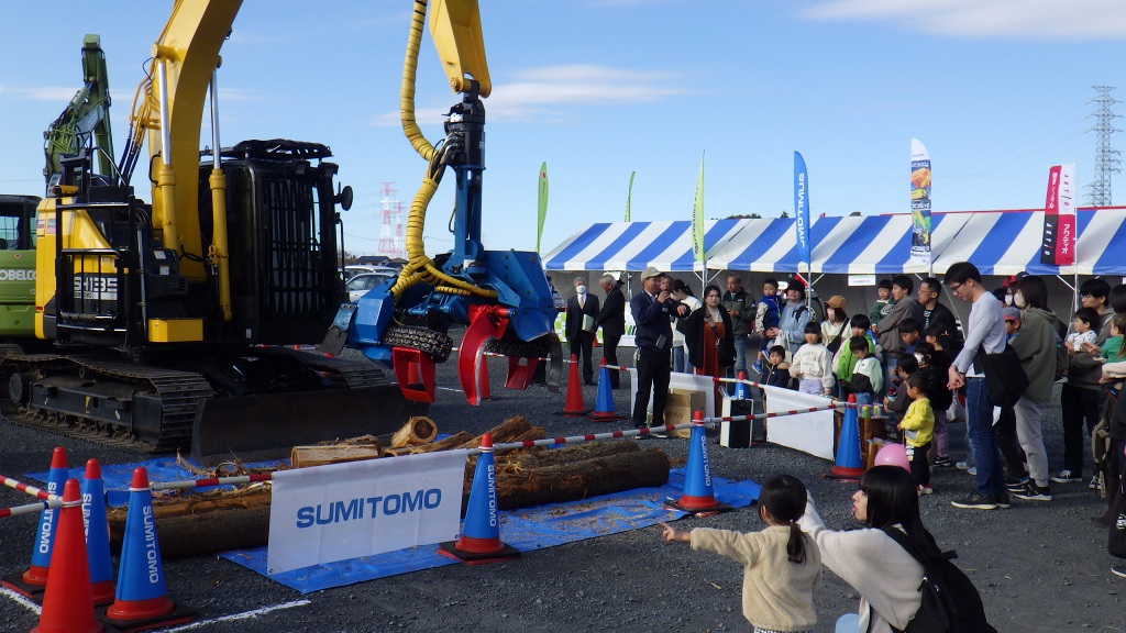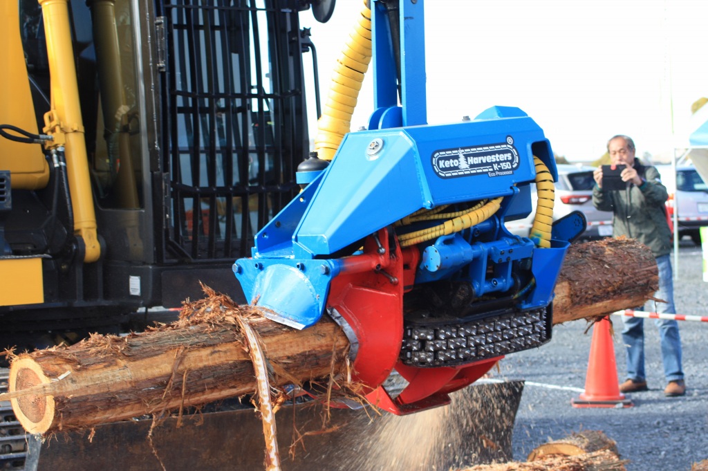 さらに、高性能林業機械の展示・実演コーナーでは、最新鋭の機械が並び、普段、一般の方々はなかなか目にすることの出来ない森林内での樹木の伐倒、枝払い、集材などの機械作業を目の前で観て、その迫力・性能・威力に歓声を上げていました。